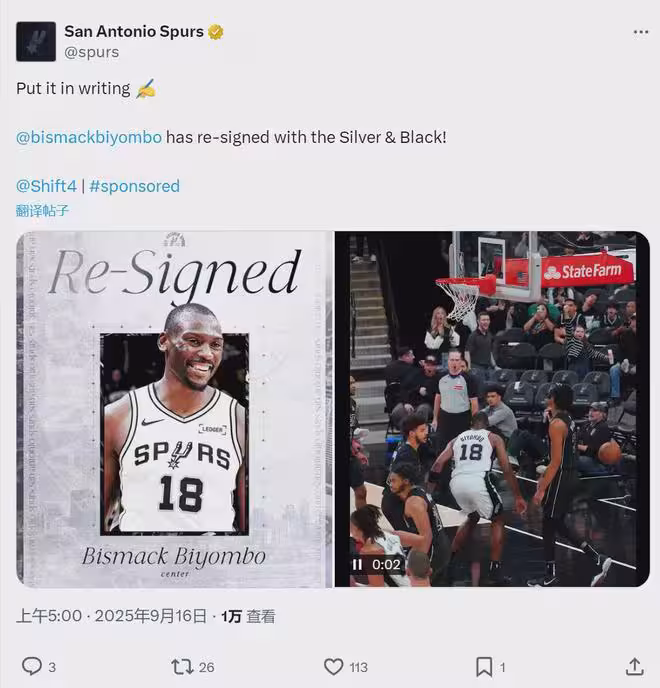 這是一年無保障合同,加上比永博的話,馬刺15人正式名單已滿,休賽期引援正式結束。比永博出生於1992年8月28日,身高2米03,2011年首輪7號秀。上賽季他在馬刺場均出戰18.9分鐘,得到5.1分5.6籃板1.1助攻0.8蓋帽。