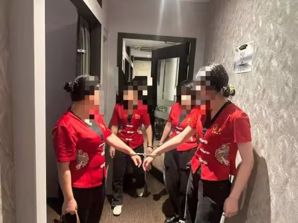 在行動中落網的外籍按摩師,被銬上手銬。