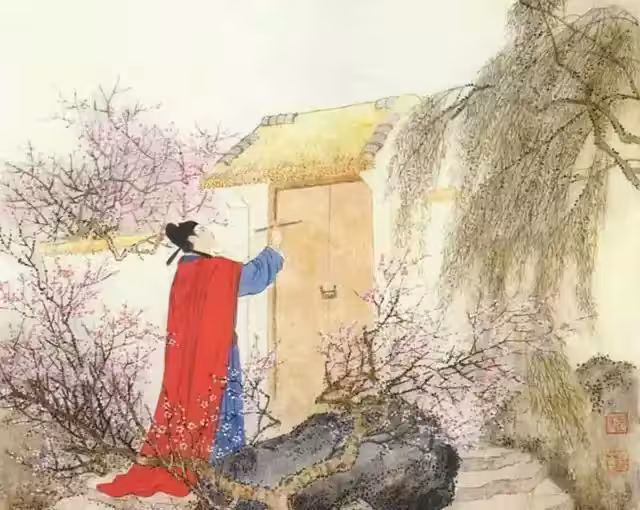 崔護把衣服帽子整理好,又去敲門。但等了好久,還是沒人來開門。