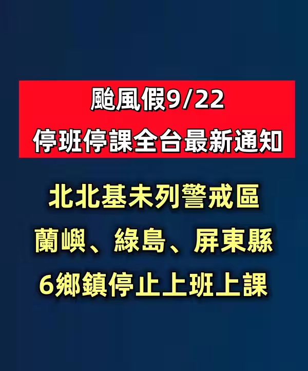 快訊/颱風假9/22停班停課全台最新通知 ,北北基未列警戒區 蘭嶼、綠島、屏東縣6鄉鎮停止上班上課...