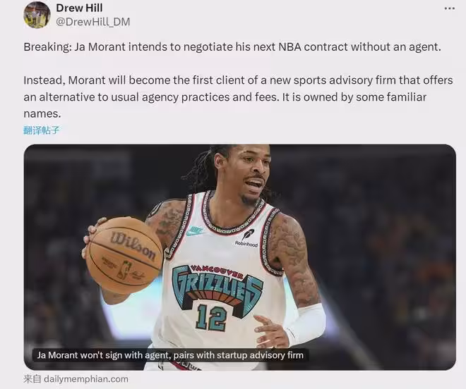 據灰熊記者Drew Hill報道,莫蘭特打算在沒有經紀人的情況下,和灰熊續約談判。莫蘭特現有合同5年1.97億美元,2028年夏天到期,未來三年薪水分別是:3945萬、4217萬和4489萬美元。目前續約的話,最多能簽2年1.284億美元。
