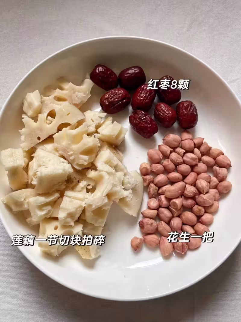 先把蓮藕洗凈切塊,用刀拍一下,這樣更容易出味。紅棗和花生稍微泡一下。全部材料放進鍋里,加足水,大火燒開轉小火慢燉一個小時,直到湯色變濃就好。