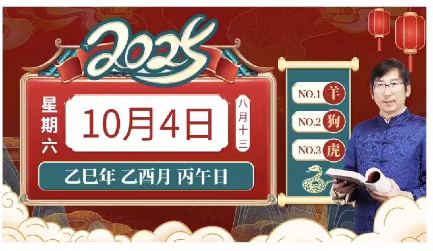 小運播報:2025年10月4日,星期六,農曆八月十三 (乙巳年乙酉月丙午日),法定節假日。