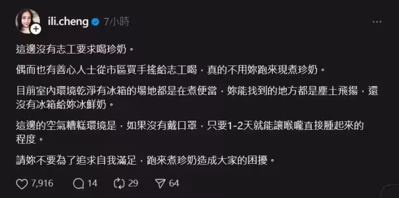 除此之外,女星鄭家純也親自到該文章底下留言,表示「這邊沒有志工要求喝珍奶。偶而也有善心人士從市區買手搖給志工喝,真的不用你跑來現煮珍奶。目前室內環境乾淨有冰箱的場地都是在煮便當,你能找到的地方都是塵土飛揚,還沒有冰箱給你冰鮮奶,這邊的空氣糟糕環境是,如果沒有戴口罩,只要1-2天就能讓喉嚨直接腫起來的程度」,並在最後補充一句「請你不要為了追求自我滿足,跑來煮珍奶造成大家的困擾」。