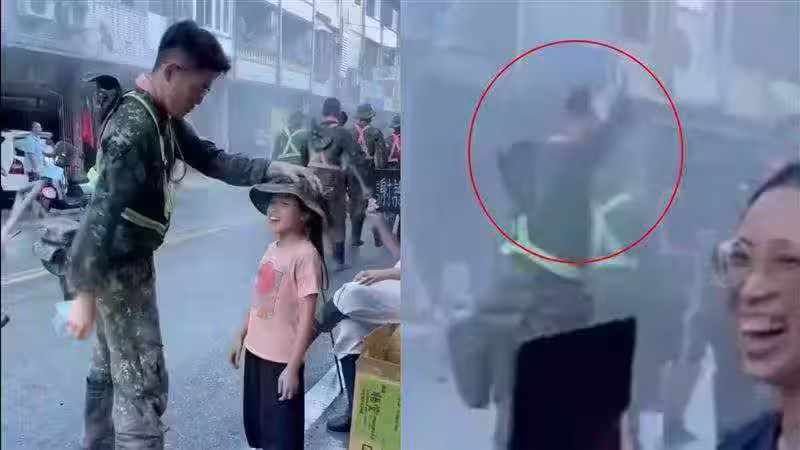 有小女孩興奮朝國軍隊伍擊掌,其中一名軍人順手將自己的迷彩叢林帽戴在小女孩頭上,小女孩又驚又喜,畫面在網絡上瘋傳賺人熱淚,如今卻有質疑「拿公發帽子送人」;對此,當事弟兄回應:「我沒偷鄰兵叢林帽,也沒有撿遺漏在地上小帽,平時就有多一頂」。