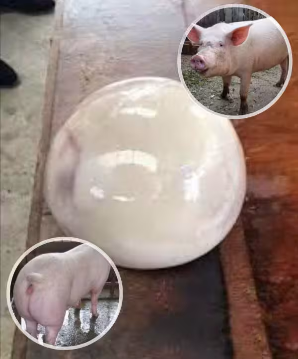 中國重慶豬農李沖宰殺一頭養了八年的母豬,剖開肚子時,突然掉出一大顆光滑圓球。