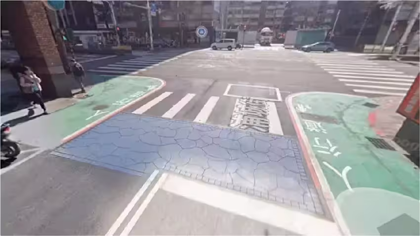 交通局指出,藍色柏油壓花不只是辨識用標誌,更能讓車輛經過時產生輕微震動,讓駕駛透過體感自覺「該減速、禮讓行人」。