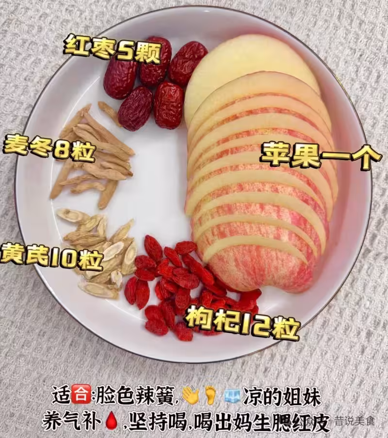 食材:蘋果1個、黃芪5克、紅棗3顆、麥冬5克、枸杞5克、清水800毫升、冰糖少許(可選)