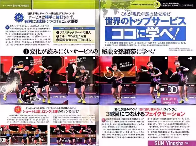 更值得關注的是,孫穎莎藉助向上揮起球拍的假動作,流暢地轉入了第三板進攻的準備姿態,韋晴光點出,即便發球本身的旋轉強度不大,但憑藉強力的第三板進攻和難以預判的變化向對手施壓,從而相對地提升了發球的威力,這正是孫穎莎的獨特風格;韋晴光還透露了中國桌球發出穩定低平發球的基本要領:「短球擊球高度在肩,長球擊球高度在腰」,而連拍圖中顯示,孫穎莎的擊球幾乎都在肩部的高度