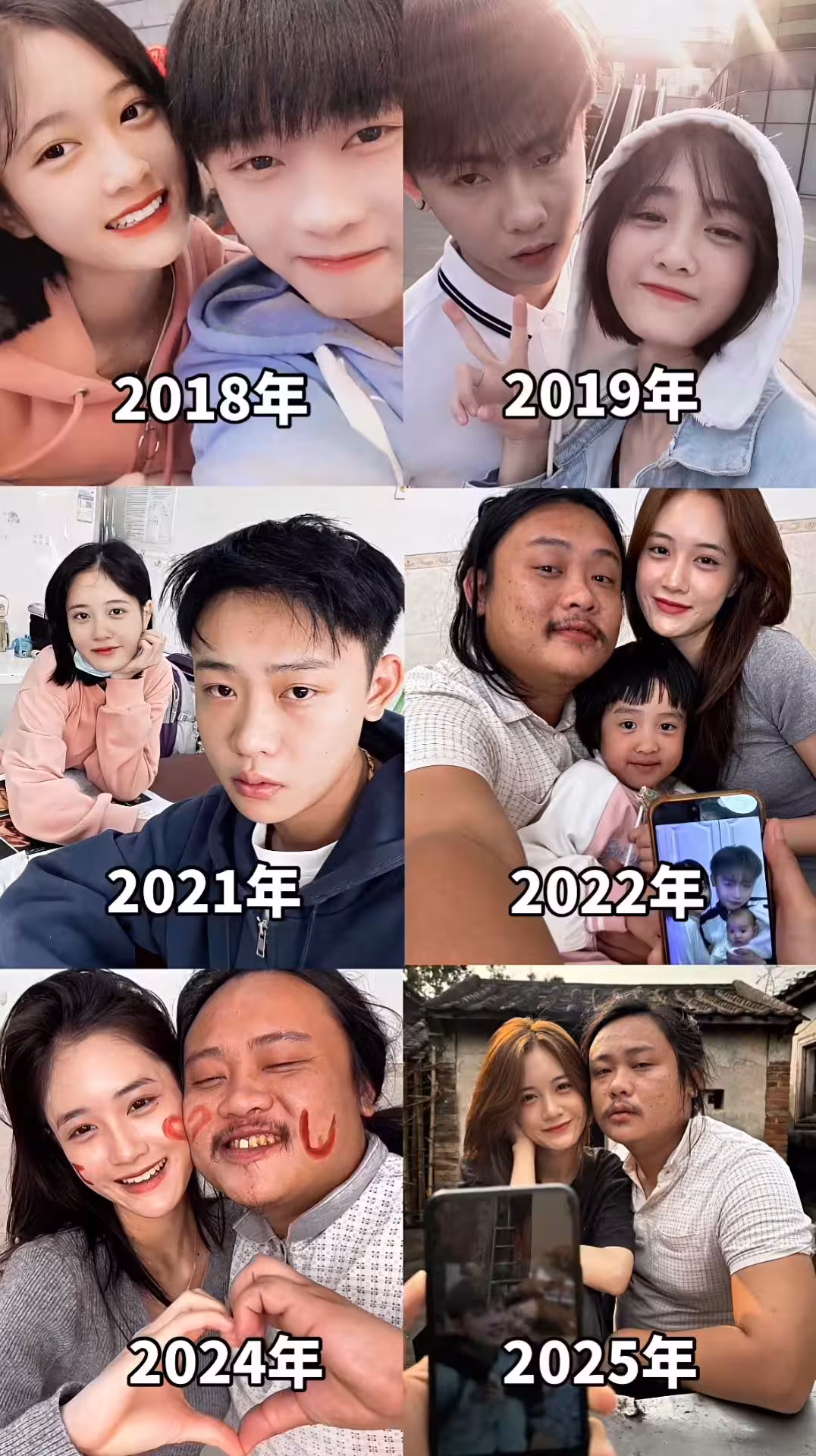 在這組照片中,女生的容貌幾乎沒有變化,依舊保持著青春的容顏。然而,男生的變化卻讓人驚訝。從2018年的年輕小伙,到2025年的滄桑大叔,他的變化之大,讓人不禁好奇背後的原因。