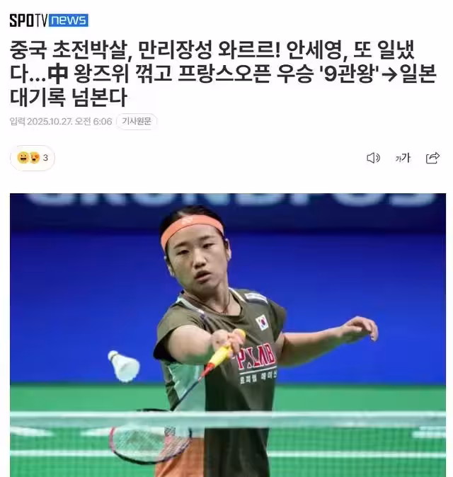北京時間10月27日,韓媒《Spotv News》發文:羽毛球女帝連續擊敗高昉潔、陳雨菲、王祉怡三位中國羽毛球名將在法國奪冠,完成賽季第九個冠軍。