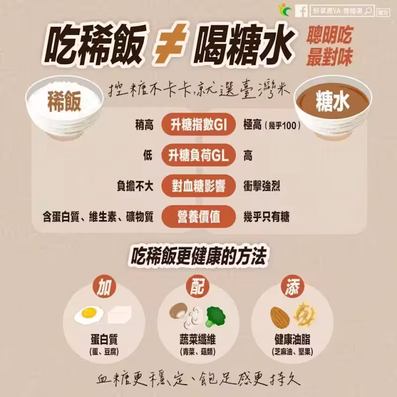 而要論及稀飯與糖水的差異,就要先了解升糖指數 GI 與升糖負荷 GL,前者GI代表食物升高血糖的速度,後者GL則是要同時考慮「GI × 食物分量的碳水化合物含量」。農糧署指出,稀飯的水分多,一碗稀飯所含的碳水化合物總量低,GL值並不高,對血糖衝擊沒想像中大;至於糖水的 GI 幾乎是 100,GL 也高,對血糖衝擊大,所以依升糖特性而言,吃稀飯與喝糖水並不相同,和糖水相比,稀飯不只水分多,營養也更完整。