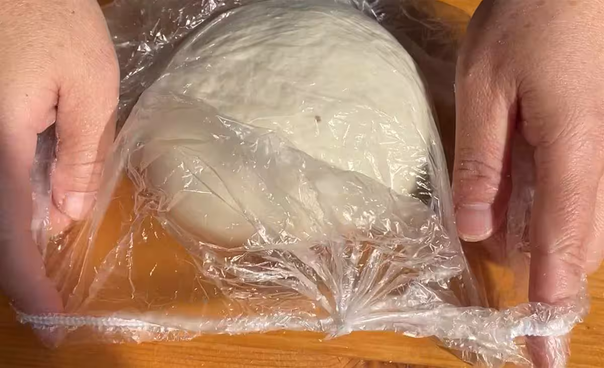 大碗里準備100克的普通麵粉,加50毫升的食用油拌勻,玉米油花生油大豆油都可以,拌勻把面絮充分的搓酥,搓成這樣細膩的狀態,整圓,都放回碗里發酵。