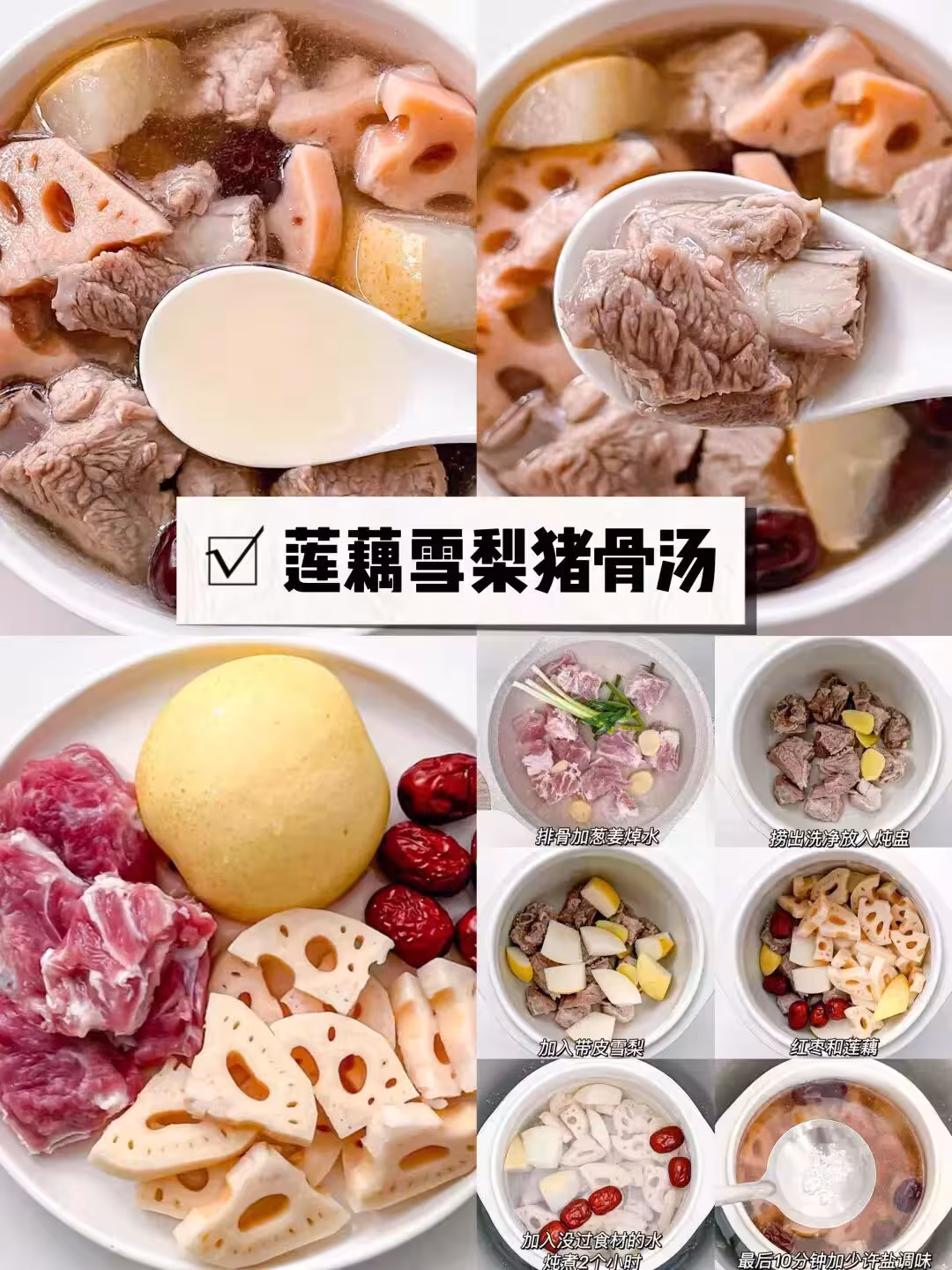 製作步驟: 排骨🍖加蔥姜焯水 撈出洗凈放入燉盅 加入帶皮雪梨 紅棗和蓮藕 加入沒過食材的水 燉煮2個小時 最後10分鐘加少許鹽調味