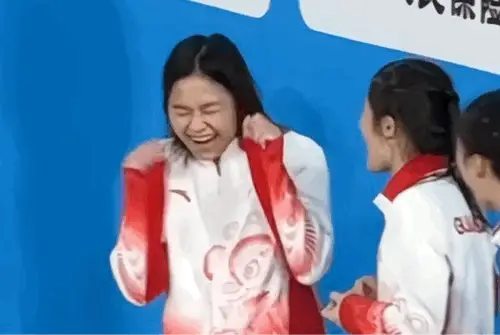 全紅嬋頒獎現場開心秀金牌,「掰手腕式」握手慶祝後飛速跑向觀眾台撿起大家愛的禮物