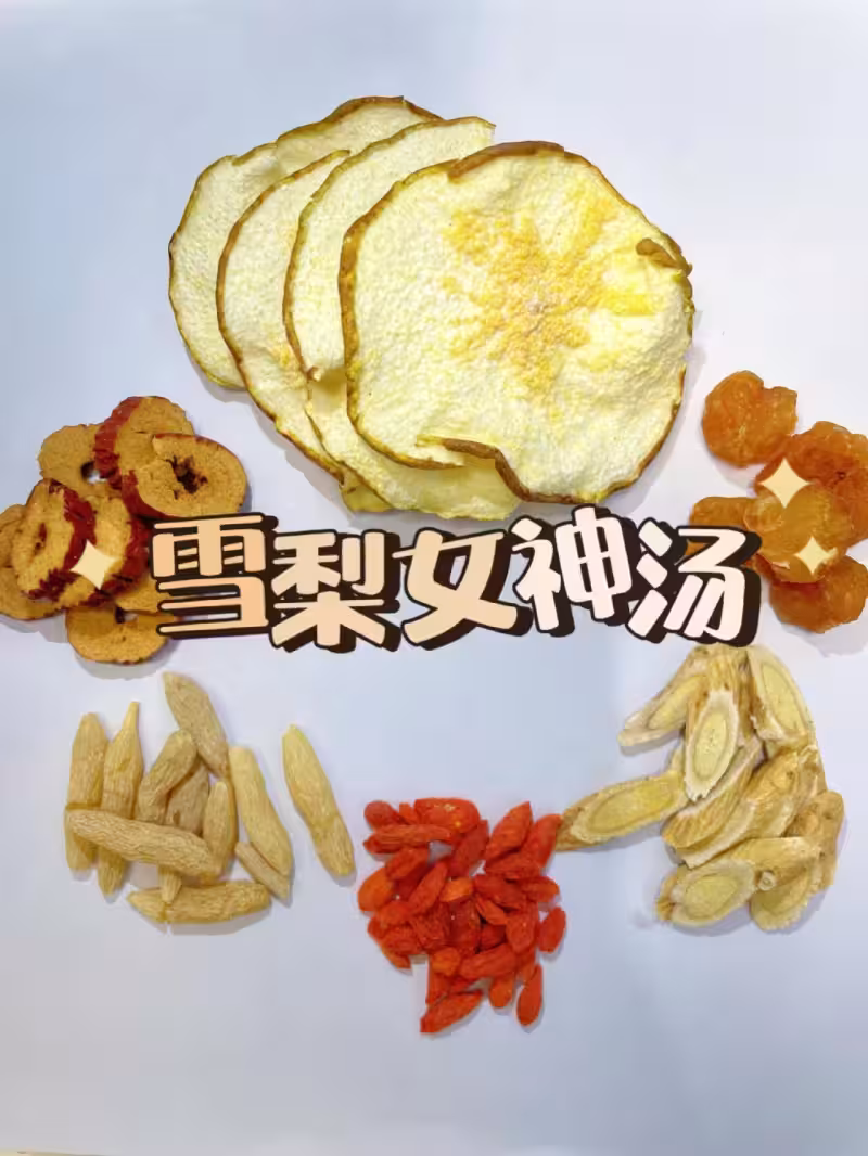 雪梨40片,桂圓5顆,黃芪 5g,麥冬5顆。紅棗5顆,枸杞8顆