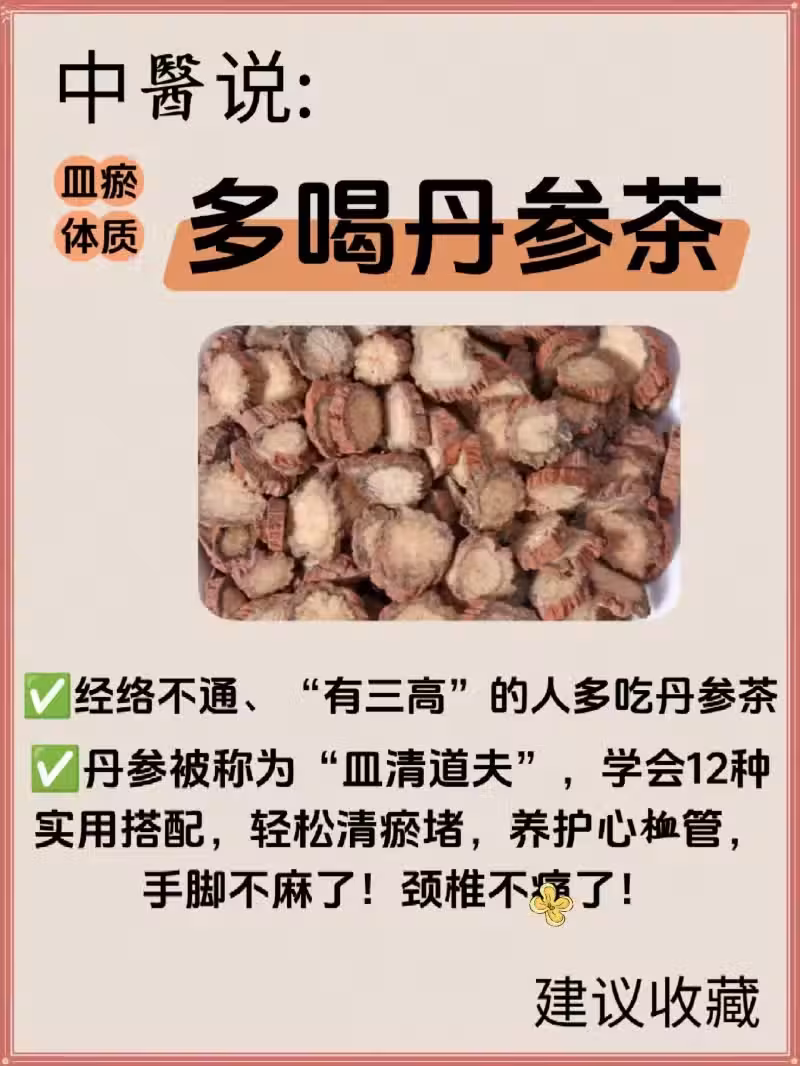 ✅丹參性微寒、味苦!中醫認為:寒性的藥物有清熱、下火、解du等作用 。丹參微寒的特性有涼xue的作用,苦味則有泄、燥的作用傾向,苦能降泄,有助於丹參去瘀,使xue液通暢;苦又能燥濕,可調節體內的水濕代謝 ,丹參常用於多種因皿瘀、/熱等引發的問題,如心煩不眠、月經不調、胸腹不適等。