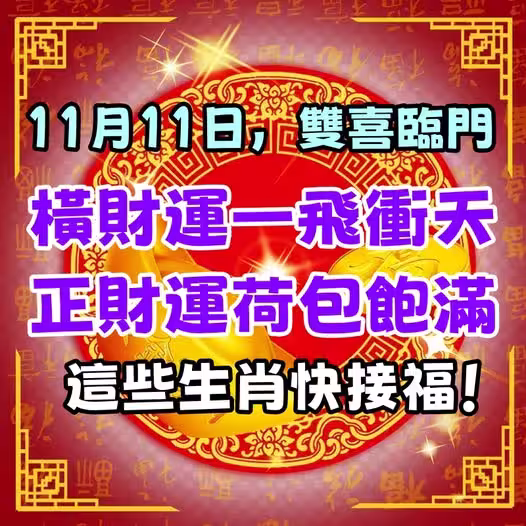 11月11日,雙喜臨門,橫財運一飛沖天,正財運荷包飽滿,這些生肖快接福~