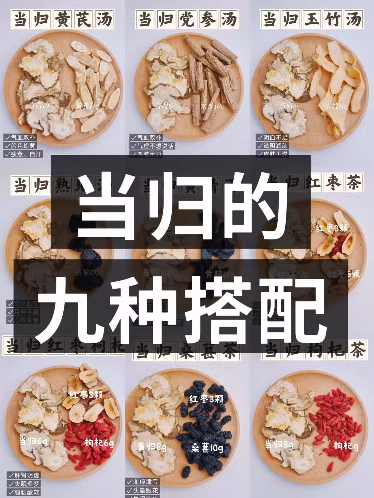 👋寶子們,今天來給大家分享一味材料 —— 當歸。當歸可是個寶,它對於補❤、姨媽不準時、、姨媽難受不舒服、潤腸通便等功效。下面就給大家介紹幾種當歸的幾大搭配,讓我們一起養出好氣色。💃