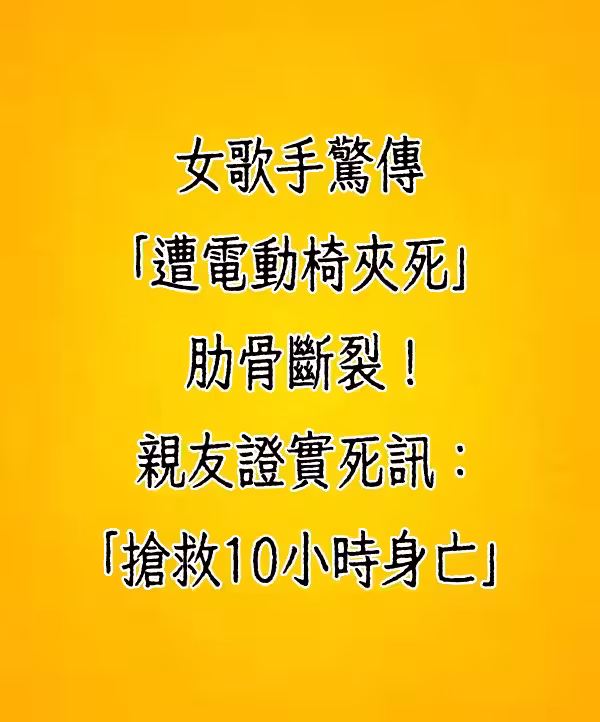 女歌手驚傳「遭電動椅夾死」肋骨斷裂!親友證實死訊:「搶救10小時身亡」