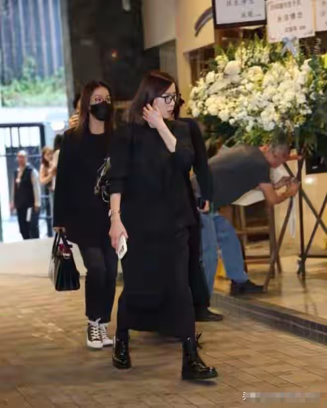 黃子華、黃宗澤穿著便服,口罩遮不住嚴肅的神情,默默在靈前鞠躬,停留了很久才離開。