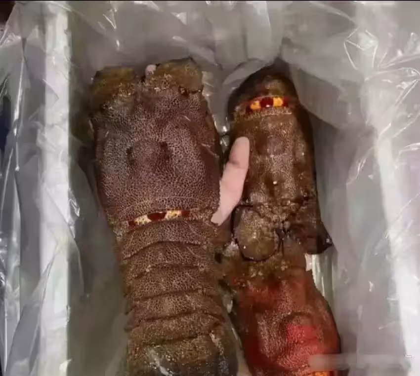 這些海鮮呈棕紅色,外形粗獷而堅硬,表面布滿了複雜的紋路,頭部還帶有顯眼的紅黃相間的斑紋。