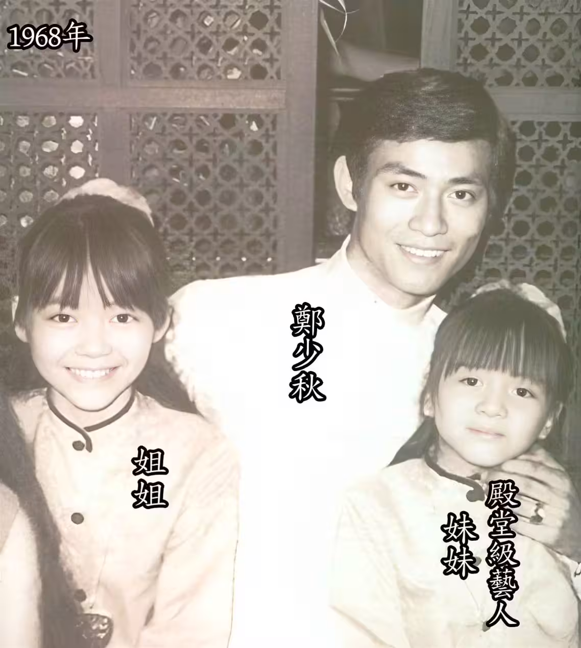 1968年的一張舊照片中,年輕的鄭少秋懷裡依偎著一位天真爛漫的小女孩。