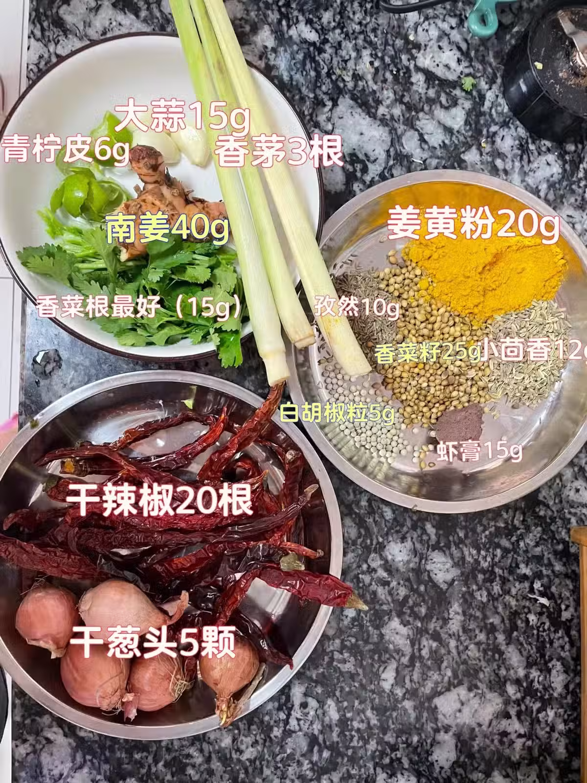 製作:將烘烤過的干香料全部攪打成粉,濕香料中的干蔥,大蒜都烘烤一下,再與其他濕香料攪打,最後二者拌勻,⚠️攪打濕過程中需要加入適量的食用油,不然不易攪打成泥!