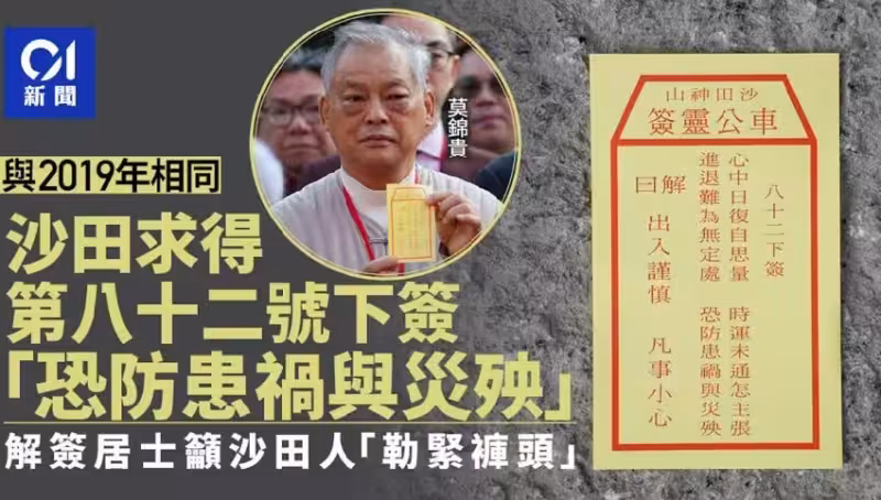 更令人背脊發涼的是,今年春節期間,香港政府依慣例在沙田車公廟舉行求籤儀式,沙田鄉事委員會主席莫錦貴抽中下籤第82簽。