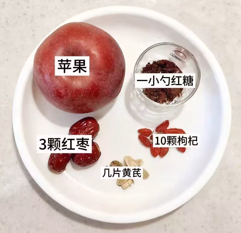 一個蘋果、紅棗3顆、枸杞10顆左右、幾片黃芪、一小勺紅糖,蘋果去核切塊不用削皮,紅棗掰開去核,黃芪用乾的就行,鍋里加3碗水,蘋果紅棗黃芪一起下鍋,大火煮開轉小火煮15分鐘,最後5分鐘放枸杞,出鍋前加點紅糖攪勻就可以了。