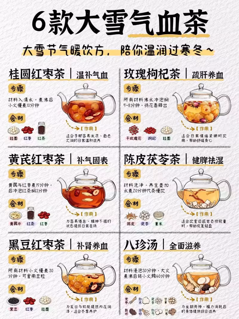 大雪至,冬至近,這可是一年裡最該「藏養」的日子。天冷會讓血管收縮,氣血跑得慢,沒法好好送到手腳末梢,身體得耗更多陽氣來保暖,久了就容易氣血兩虛。與其靠多穿衣服硬扛,不如泡上一杯暖茶,從裡到外把暖意捂牢,把氣血養得足足的。今天就給大家分享6款超適合冬日的氣血茶,做法簡單,喝著舒服,還能把冬天的「藏養」功課做滿~