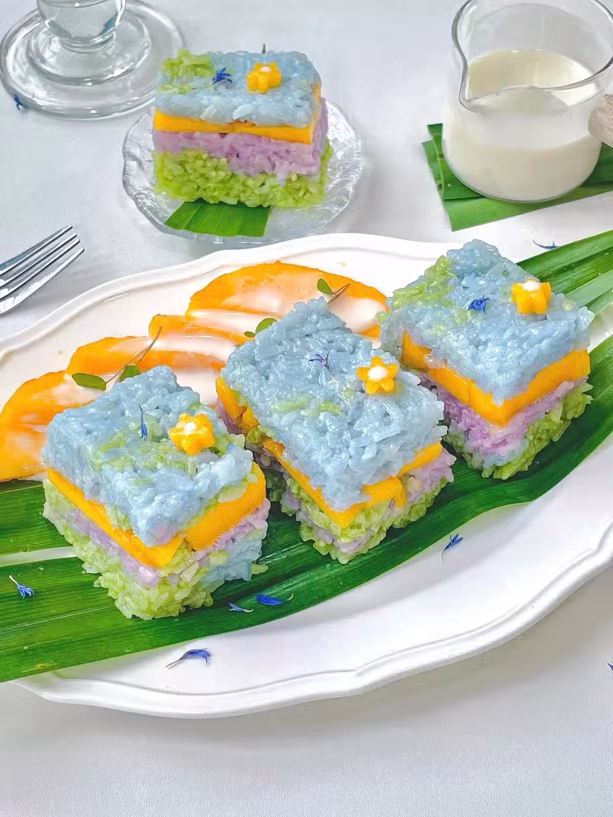 天氣越來越熱啦🔥 清爽的椰香芒果🥭糯米飯 🍃專治沒有胃口的夏天🍃 今日分享🌈 油畫風🖼️芒果糯米飯 紫色💜藍色🩵綠色💚三種糯米飯 ➕上芒果🥭 仿若油畫里跑出來的漂亮飯 吃的時候心情都變得美美滴❣️