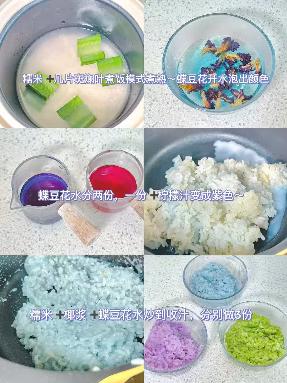3️⃣煮熟的糯米飯分3份,加兩勺椰漿,分別➕蝶豆花水/斑斕精華炒到收汁備用 椰奶👩🍳製作方法🔍 所需食材炒到粘稠即可 台式椰汁芒果🥭糯米飯 嘗試自己做了下 尊嘟好簡單‼️ 用💚天然食材調色 顏色也太好看啦🥳🥳 配上斑斕葉一起煮飯 味道也敲清新🍃🍃 仙女🧚♀️們可以安排起來啦✌️✌️