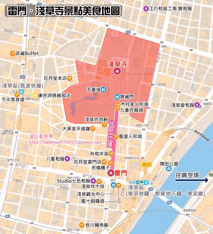 搭配波比繪製的私房淺草寺景點地圖,和附近景點晴空塔規劃成東京一日遊,好玩到爆啊。