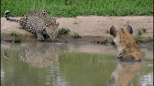 11.鬣狗面對喝水的花豹,浸泡在水中瑟瑟發抖。對花豹而言,殺死鬣狗易如反掌。