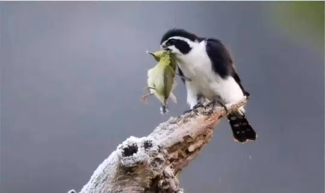 白腿小隼捕食小鳥。白腿小隼有兩個兄弟,那就是紅腿小隼、黑腿小隼,它們是世界上最小的猛禽,以小鳥、昆蟲、老鼠等為食。