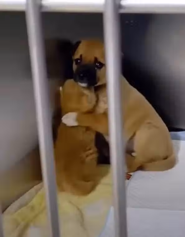 兩隻小毛孩吃飽後,還要繼續留在醫院觀察,所以就將牠們放在了一起。小奶貓依舊依偎在小奶狗懷裡,而小狗狗則用一隻手護住小貓。
