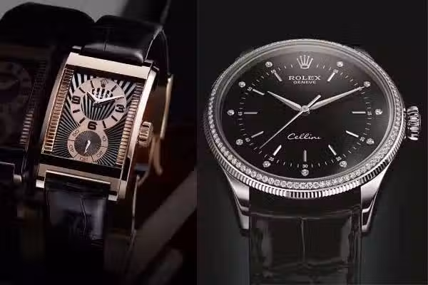 在2014年新款切里尼系列出現之前,此系列的外形一直沒有定下來,枕型、方形、圓形都有出過,2015年現行則以圓形、方形表款為主。新款Cellini Time,白金鑲鑽款,2015年(右)。