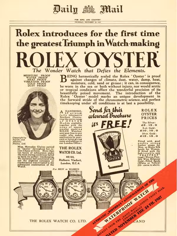1927年,英國人梅塞迪絲•吉莉絲 (Mercedes Gleitze) 佩戴勞力士蚝式腕錶成功橫渡英吉利海峽,勞力士防水性一炮打響。