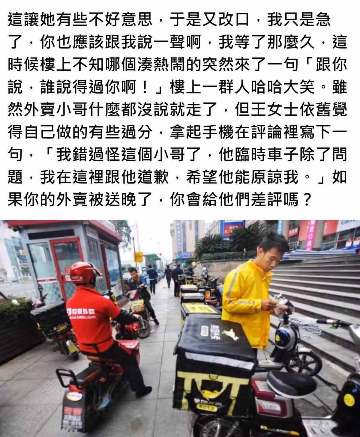 外賣遲到1小時才來!生氣準備給差評 5歲兒子指指「騎手的車」,後寶媽愣了 :希望他能原諒我