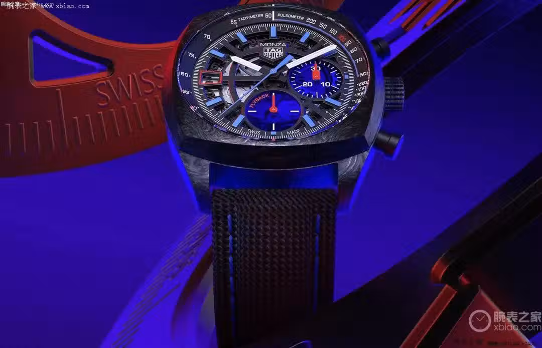泰格豪雅用全新的蒙扎飛返天文台計時錶,重新復活了歷史上曾推出的蒙扎系列手錶,經典的鮑魚殼造型採用新潮的碳纖維材質打造,小表錶盤採用了少見3、6布局,9點位置的日期窗口帶有藍色螢光效果,鮮艷的紅藍配色更是激情四射。