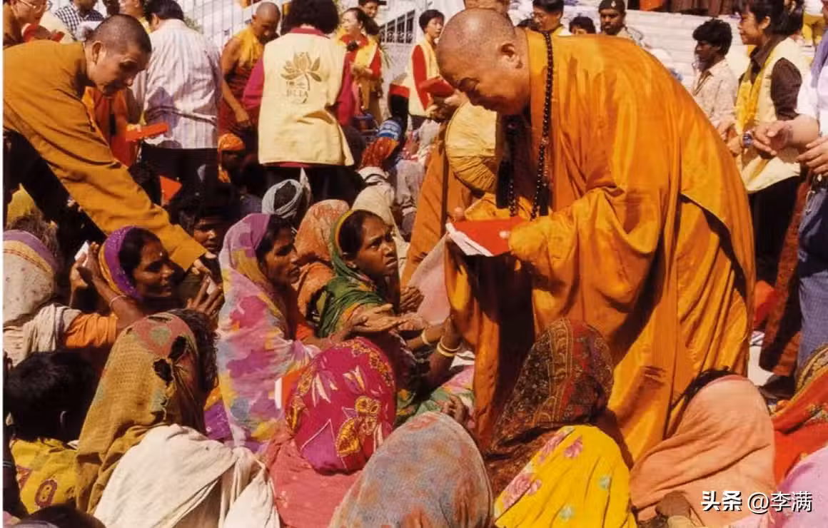 星雲於印度菩提伽耶大覺寺前,以歡喜心把紅包一一交給貧困的 300 多位婦女