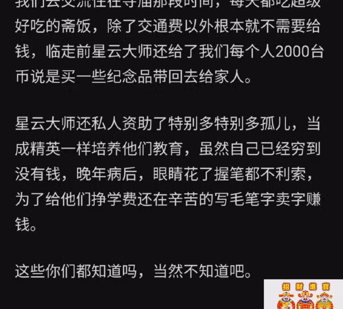 他還說臨走前,星雲大師還給了他們每個人2000台幣說是買些紀念品帶回去給家人。這次交流下來,以前他不識星雲大師,現在他徹底被打動。