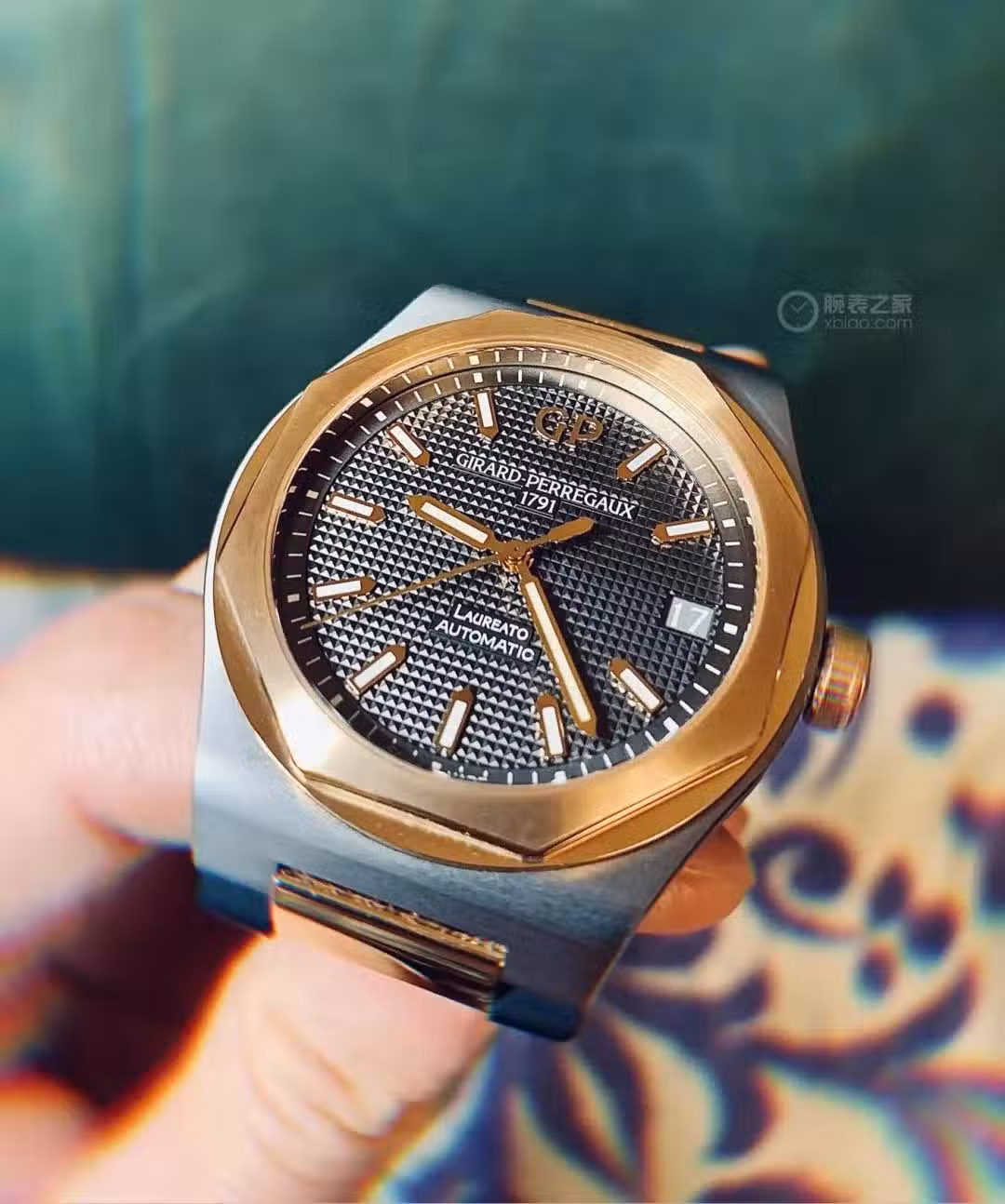 這就把話題回歸到了開頭:不是間金表不好,而是要看間金表設計的好不好?!以這枚桂冠為例,之所以選擇它就勝在三個字——層次感!金色的刻度指針,深灰色的巴黎釘紋盤面,金色的八角表圈底盤,鈦灰色的表殼表耳,最後在一體表耳錶帶處又用了金色連接,整體顏色搭配與材質應用既層次分明又富於變化,個人認為間金款的顏值反而更加出挑。