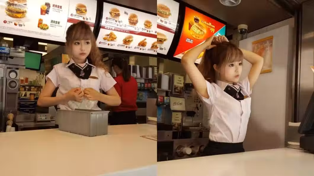 網紅「海豚」徐薇涵打工時在櫃台綁馬尾照片被封為「麥當勞女神」。(圖/翻攝自爆廢公社)