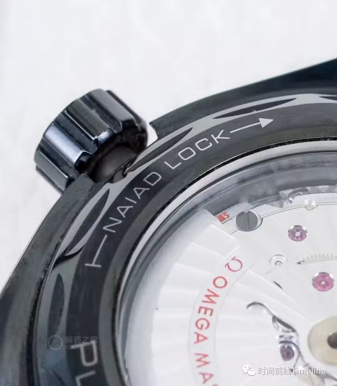 而歐米茄使用獨有的Naiad Lock底蓋技術,不需要在陶瓷殼中加工出很長的螺紋,只需要旋轉60度就可以縮鎖緊底蓋,並具備600米防水。