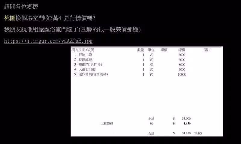 一派網友站房東那邊,相當認同:「合理啊!清運本來就貴!」、「這報價是整個門含基座都換掉。」、「不同規格自然泥作要重弄。」、「現在工錢就是這麼扯,不要懷疑。」、「以前的門、門框和現在的不一定合,要換就整組換。」但也有網友持反對態度...