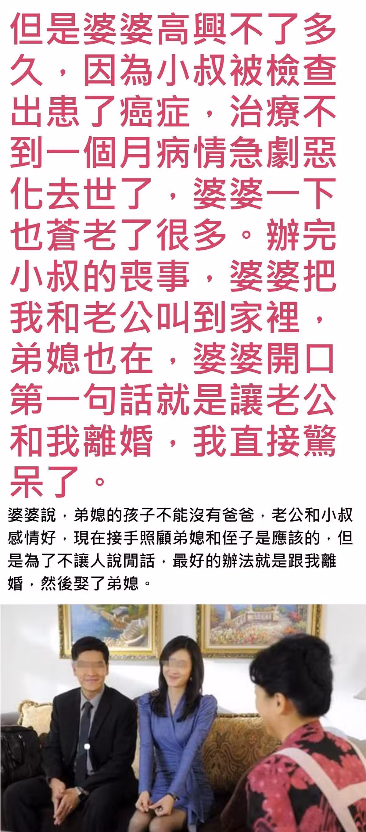 但是婆婆高興不了多久,因為小叔被檢查出患了癌癥,治療不到一個月病情急劇惡化去世了,婆婆一下也蒼老了很多。辦完小叔的喪事,婆婆把我和老公叫到家裡,弟媳也在,婆婆開口第一句話就是讓老公和我失婚,我直接驚呆了。