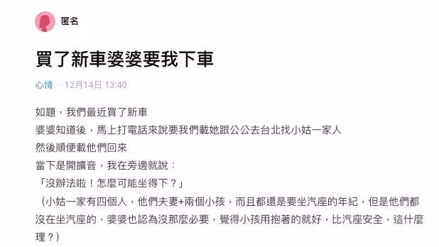原PO表示,她最近買了新車,婆婆知道後很開心,下秒卻要求他們去載她與公公開新車北上到台北找小姑一家人、再把他們都載回來,人妻一想,小姑一家有4個人(夫妻+需要坐汽車座椅的兩個小孩),再載公婆兩人根本坐不下,因此便立刻回應「沒辦法啦!怎麼可能坐得下?」