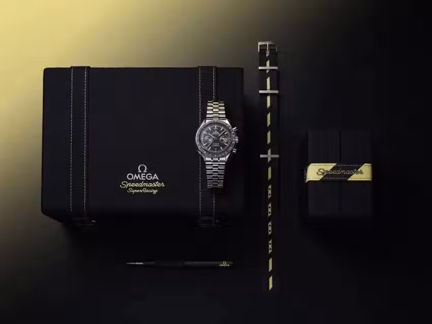 全新超霸系列Super Racing腕錶搭配精鋼表鏈,另配備一條黑黃條紋的再生尼龍NATO錶帶,與海馬系列Aqua Terra >15』000高斯腕錶的配色相呼應。